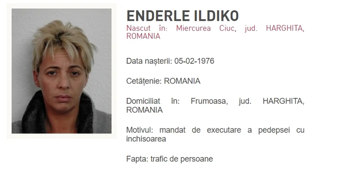 Enderle Ildiko, who was born on February 5, 1976 in Miercurea Ciuc, Harghita county, having the last domicile in the Beautiful commune, from the same county, is on this list of the Romanian Police, being sought for the execution of four arrest warrants issued on his behalf, according to Freedom.